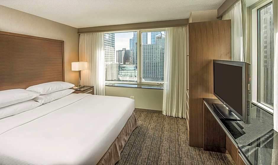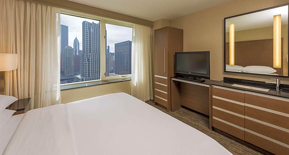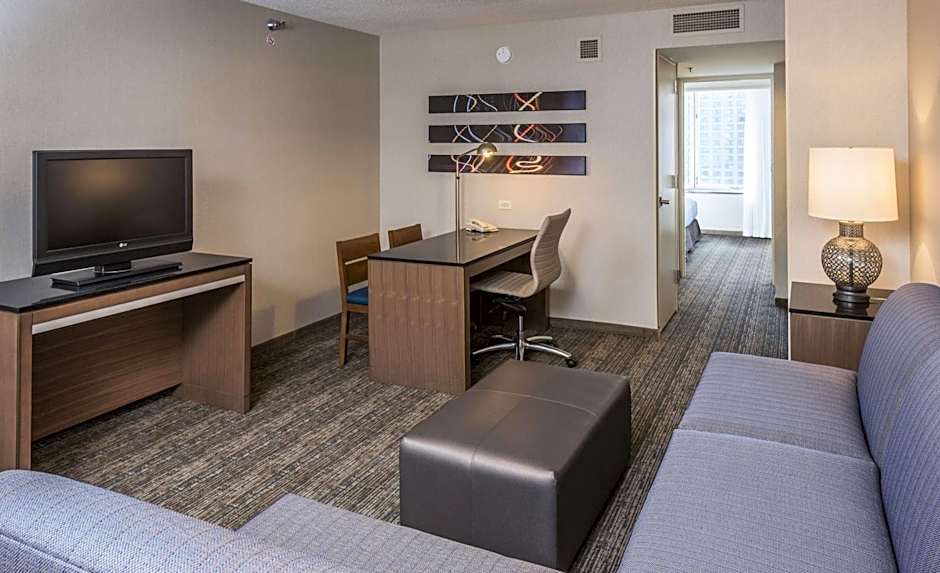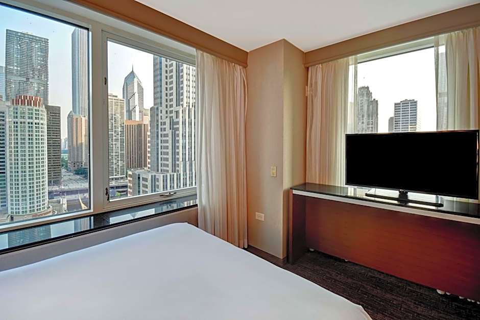 Room features include a private bedroom with a king bed, separate living room with a sofa bed, armchair, wet bar, refrigerator, coffeemaker, wired and wireless internet access, plus two 55-inch flat-screen TVs and contemporary furnishings throughout including dining table/work desk. This suite has a high floor city view of the Chicago Downtown skyline.