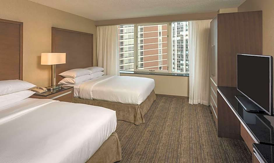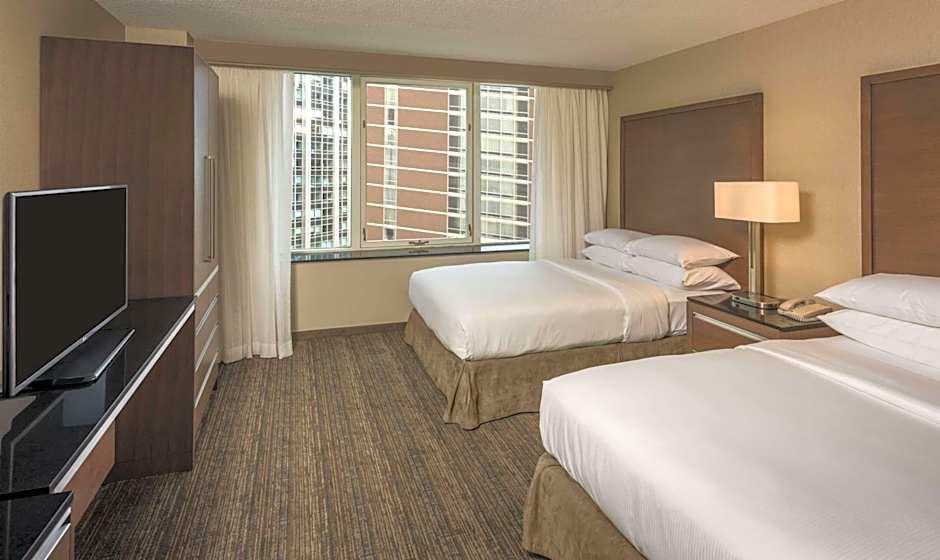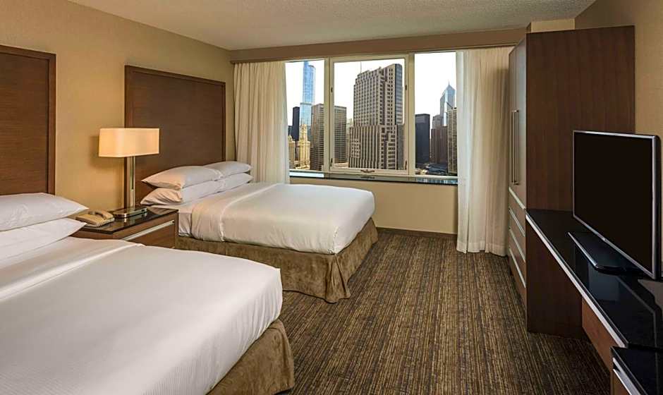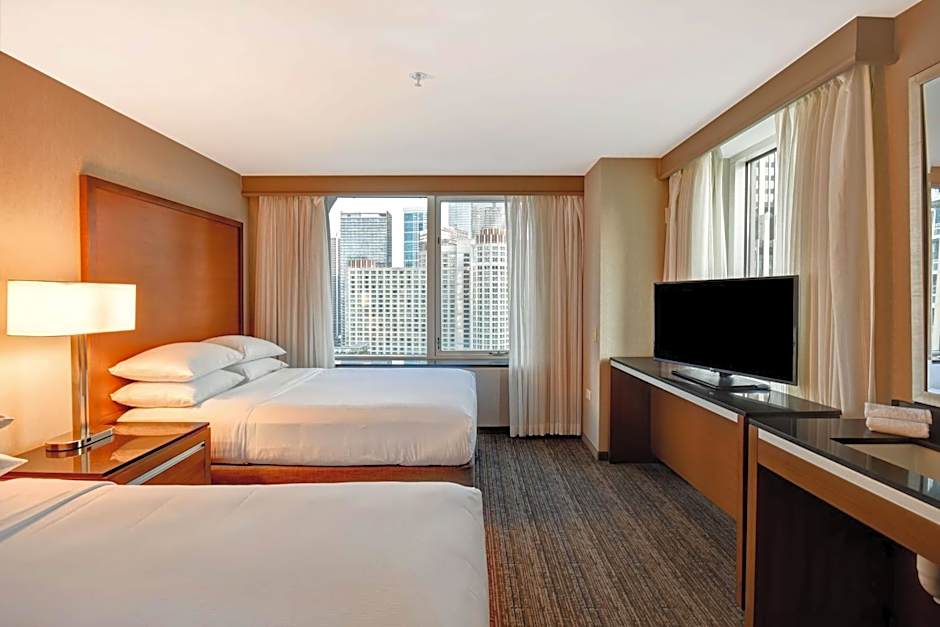 Room features include a private bedroom with two double beds, separate living room with a sofa bed, armchair, wet bar, refrigerator, coffeemaker, wired and wireless internet access, plus two 55-inch flat-screen TVs and contemporary furnishings throughout including dining table/work desk. This suite has a high floor city view of the Chicago Downtown skyline.