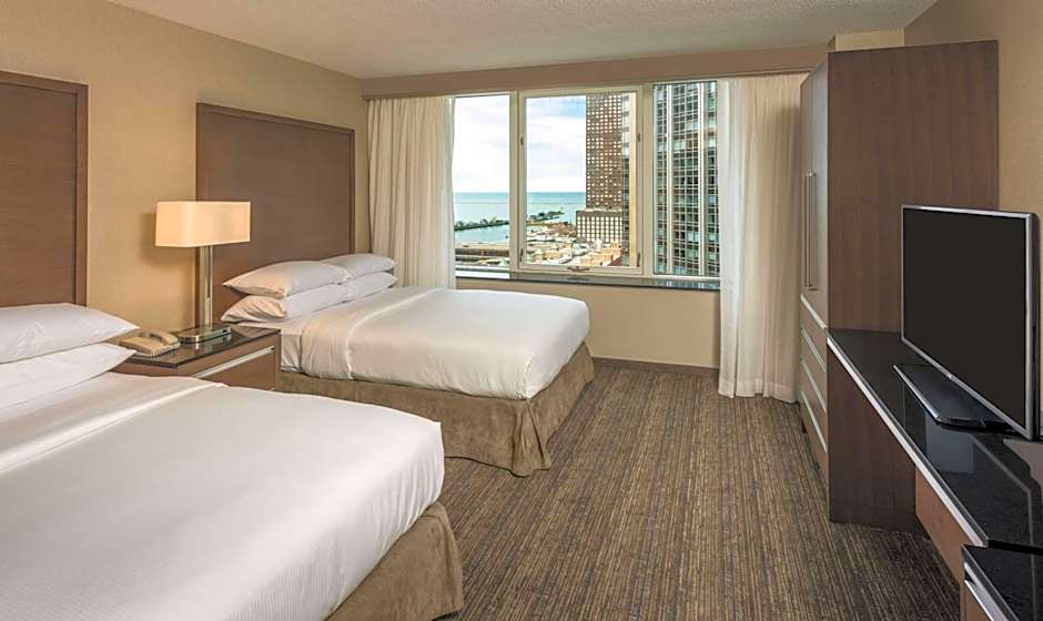 Room features include a private bedroom with two double beds, separate living room with a sofa bed, armchair, wet bar, refrigerator, coffeemaker, wired and wireless internet access, plus two 55-inch flat-screen TVs and contemporary furnishings throughout including dining table/work desk. This suite has a high floor view of Lake Michigan.